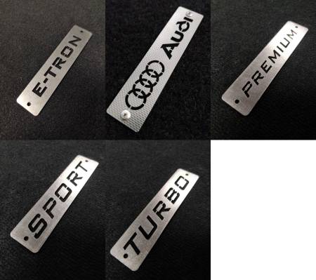 Paslanmaz çelik malzemeden üretilen E-Tron metal logoları ön paspas setine takılırlar. Metal logolar 11×2,5 cm ölçülerinde şık görünümlü, velur paspas seti için özel üretilmiş aksesuarlar olup paspasların ıslanmasından etkilenmez. Aşağıdaki görselde sunmuş olduğumuz logo seçeneklerini görebilirsiniz.