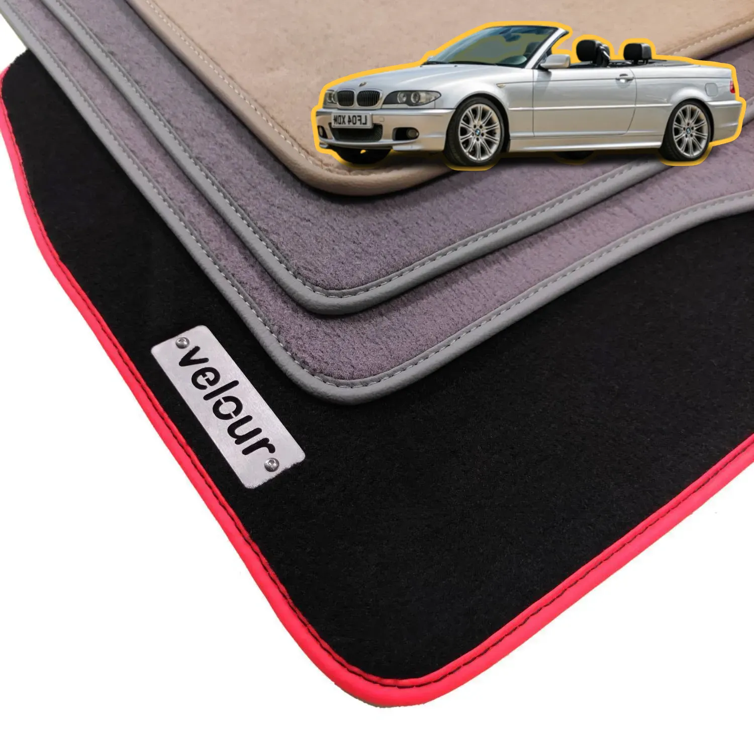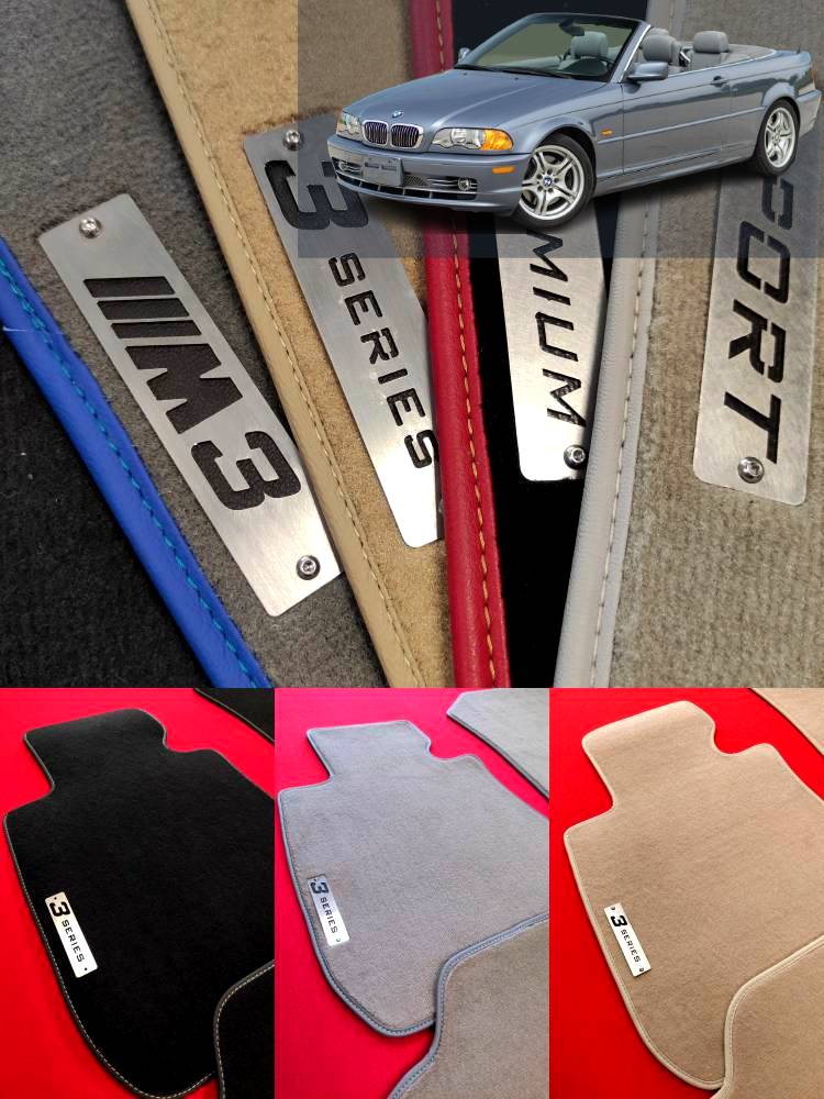 Kadife yüzeyi, seçilebilir kenar ve dikiş ipi rengi ve sahip olduğu metal logolar sayesinde BMW E46 Cabrio paspas takımı premium bir aksesuardan ne bekleniyorsa sunuyor. Kauçuk, 3D paspas gibi alternatiflerinin ucuz görünümünün aksine şık görünürler ve konforlu bir zemin sunarlar. Üstelik seçilebilir kenar, dikiş ve halı rengi sayesinde E46 Cabrio için özel tasarımlara izin verir. Kısacası velur paspas takımı, eğer şık görünüm sizin için önemliyse alternatifsiz tek seçenektir. Bu yüzdendir geçmişte üretilmiş ve günümüzde üretilen her BMW modeli standart olarak velur halı paspaslar ile sunuldu ve sunuluyor.