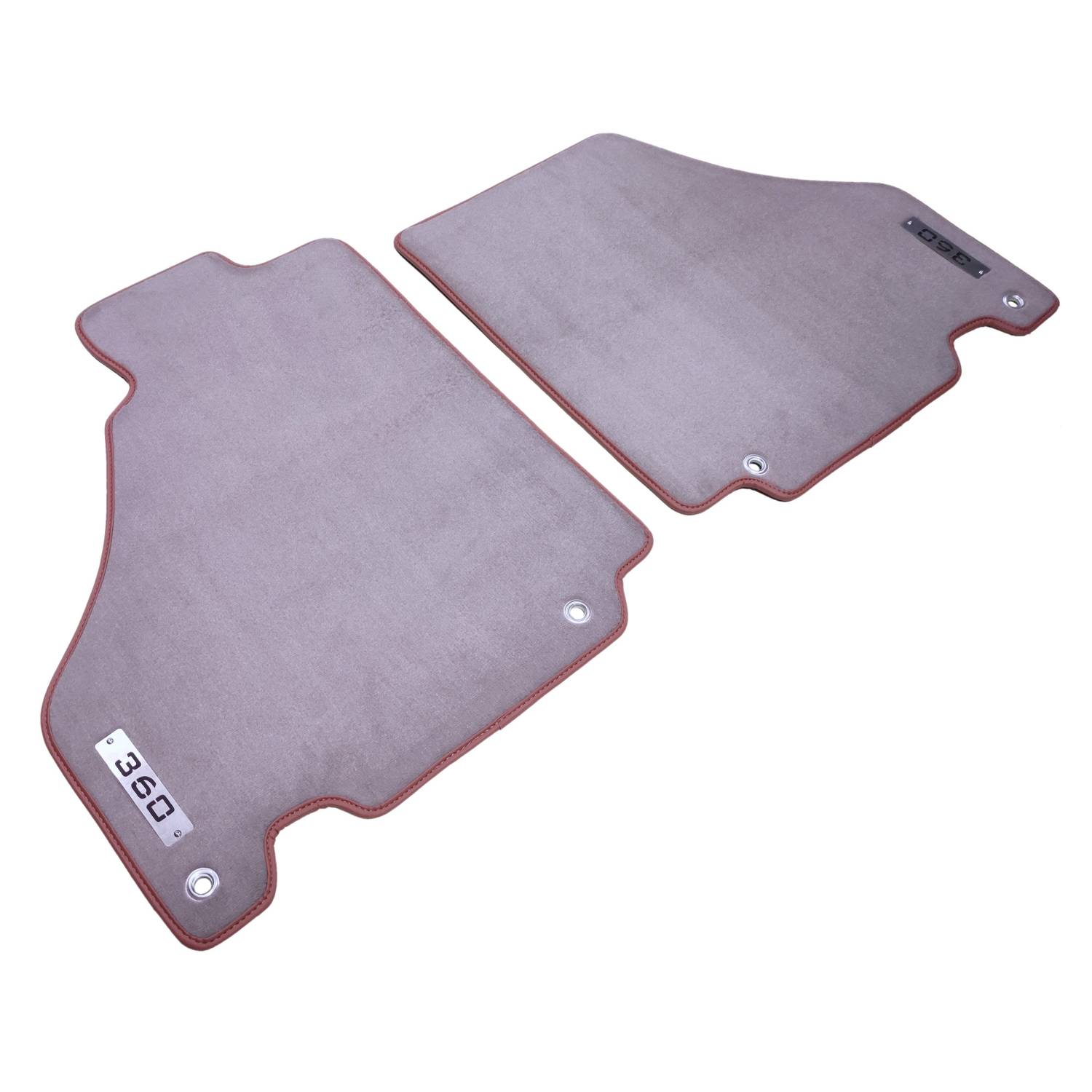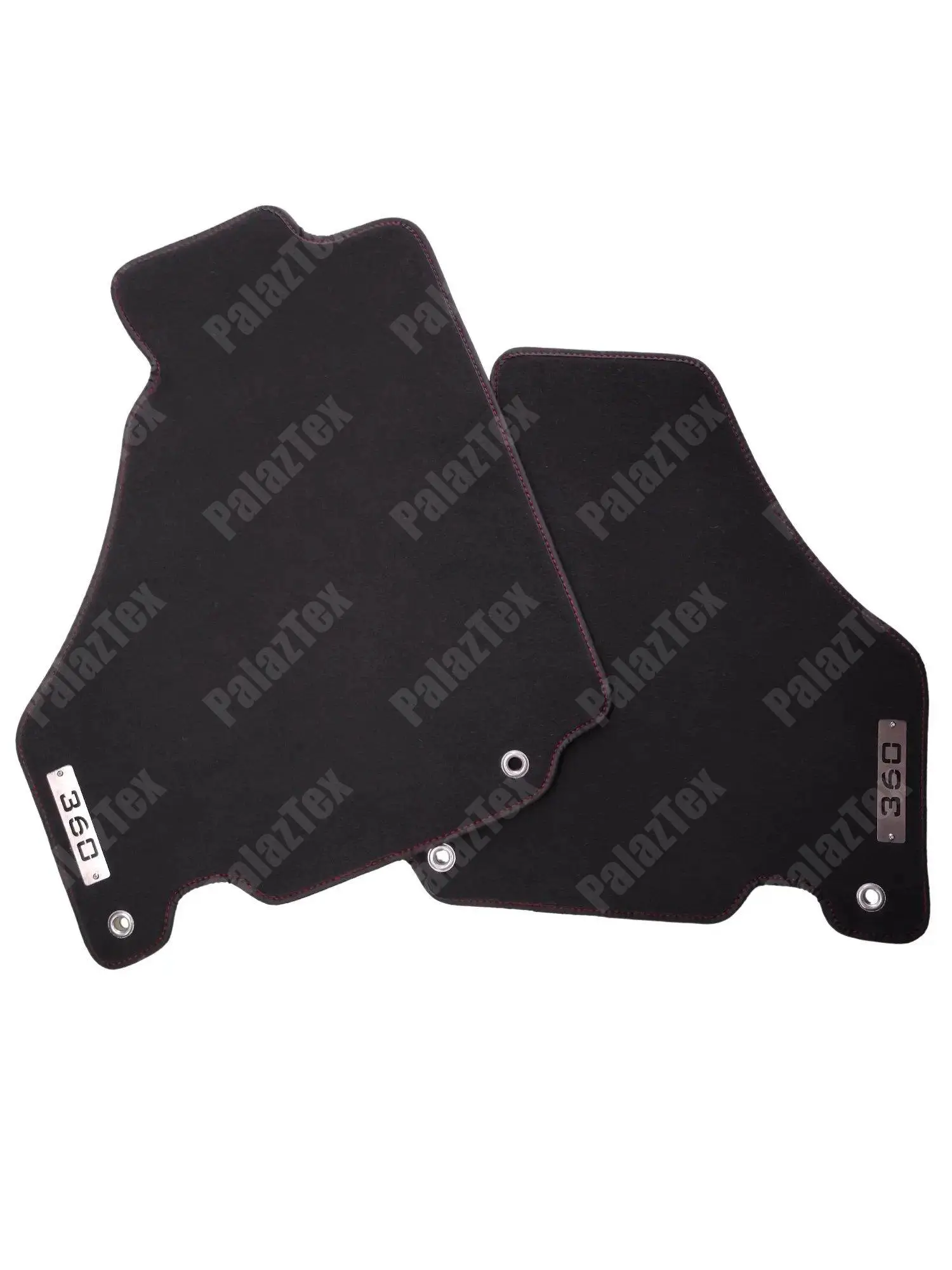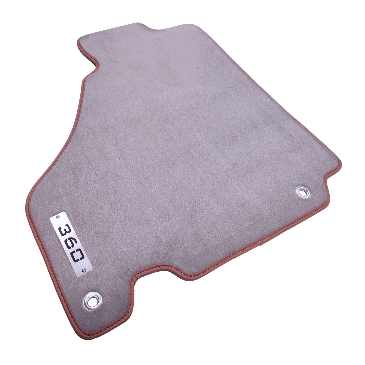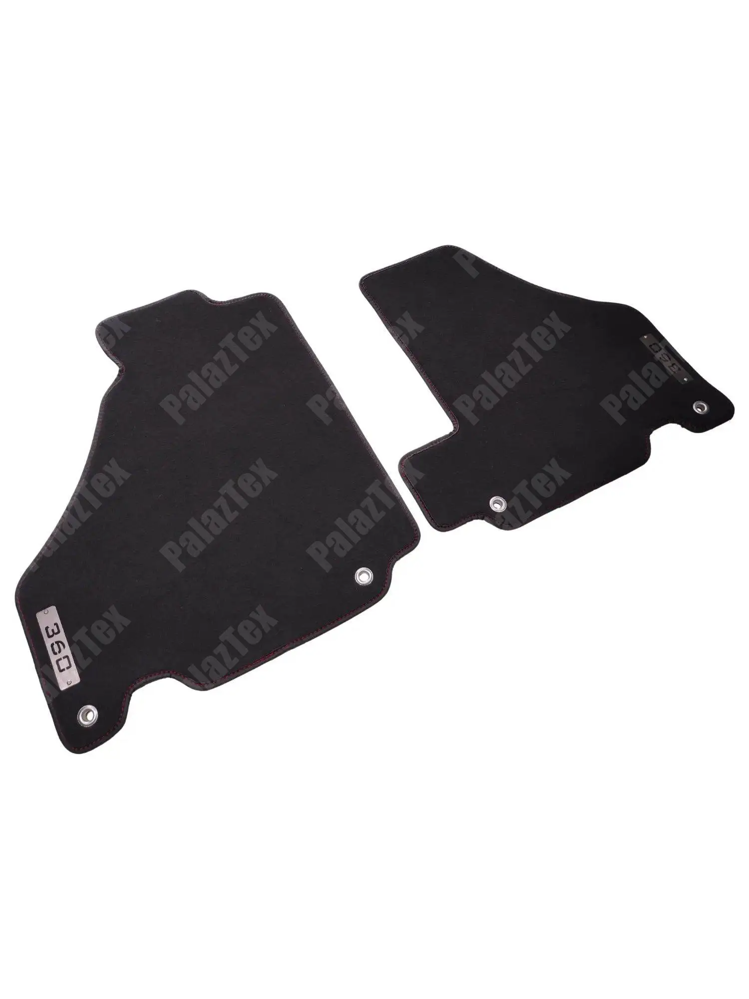 Ferrari 360 Spider ve Modena uyumlu velur halı paspas seti sürücü ve yolcu paspası olmak üzere 2 parçadan oluşmaktadır. Yumuşak kadife yüzey dokusu ile konforlu bir sürüş deneyimine katkı sağlayan kadife paspaslar, kişiselleştirilebilir yapısı sayesinde kenar, dikiş ve halı rengi seçilerek araca göre özelleştirilebiliyor. Paslanmaz çelik 360 metal paspas logoları ile süslenen kadife paspas seti için tüm özelleştirme seçeneklerini kataloğumuzda bulabilirsiniz.