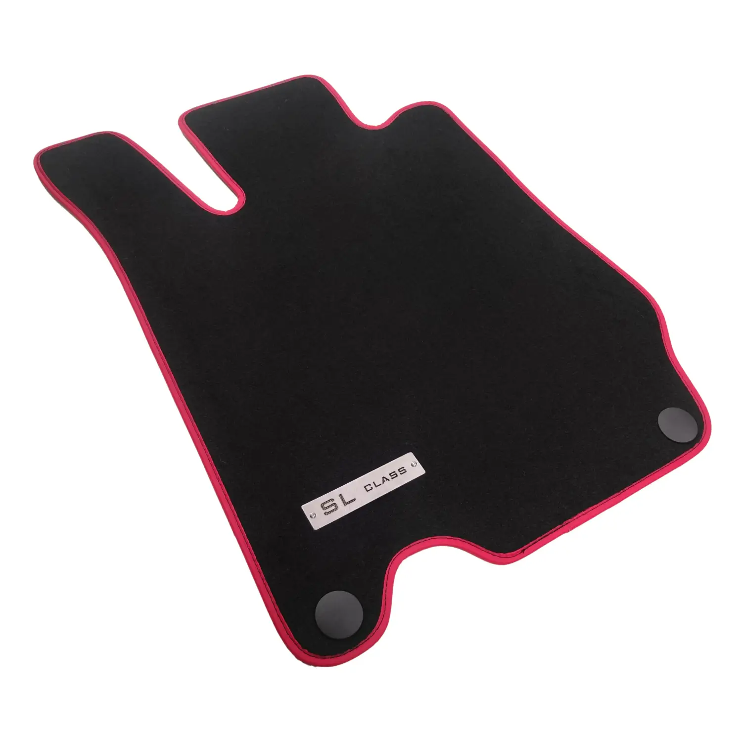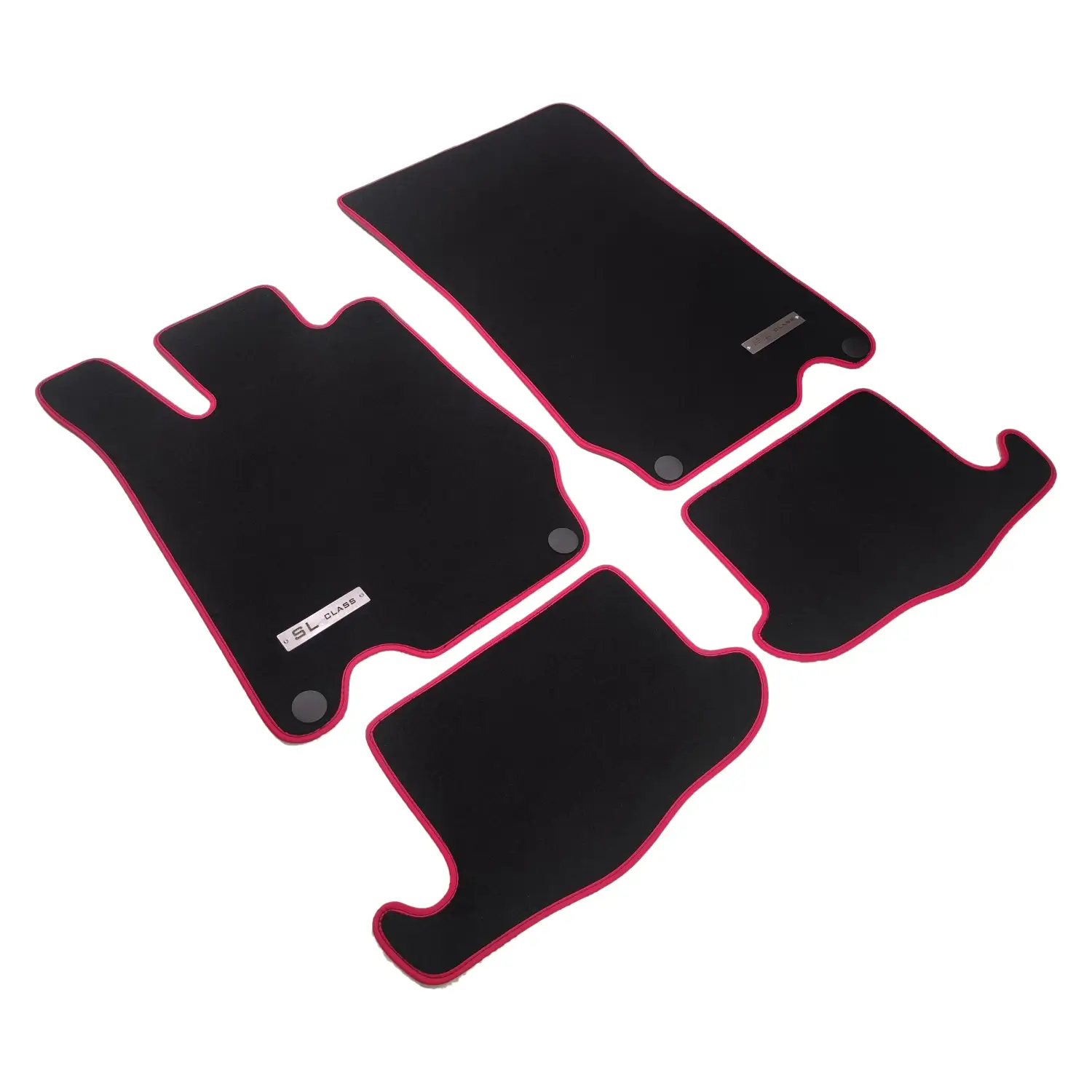 mercedes sl r230 uyumlu kırmızı kenarlı, metal sl class logolu ve klipsli siyah velur paspas