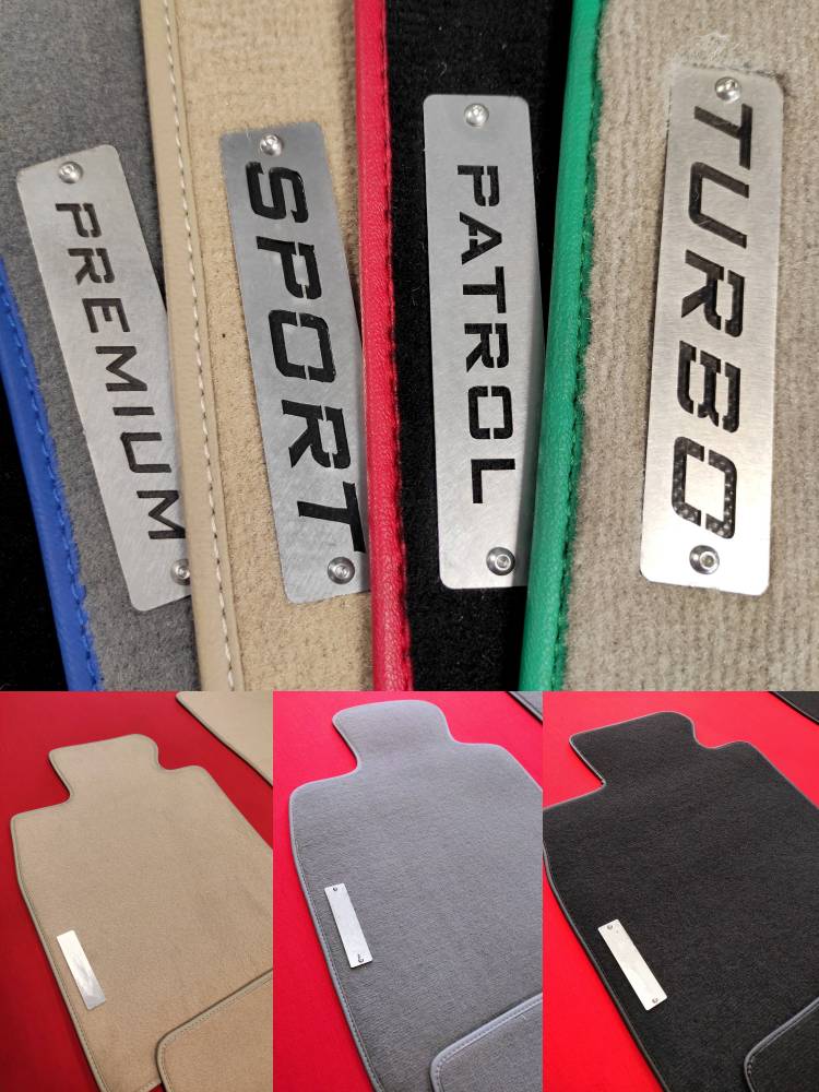 Nissan ve Patrol metal logoları ön paspaslar için özel tasarlanmış ideal boyutlu ürünlerdir (11×2,5cm). Paslanmaz çelik metal logolar velur halı paspas takımının görünümünü geliştiren detaylardan biri olup her koşulda paspaslar üzerinde ışıldarlar. Nissan ve Patrol logolarının yanı sıra diğer logo seçeneklerini aşağıdaki görselde bulabilirsiniz.